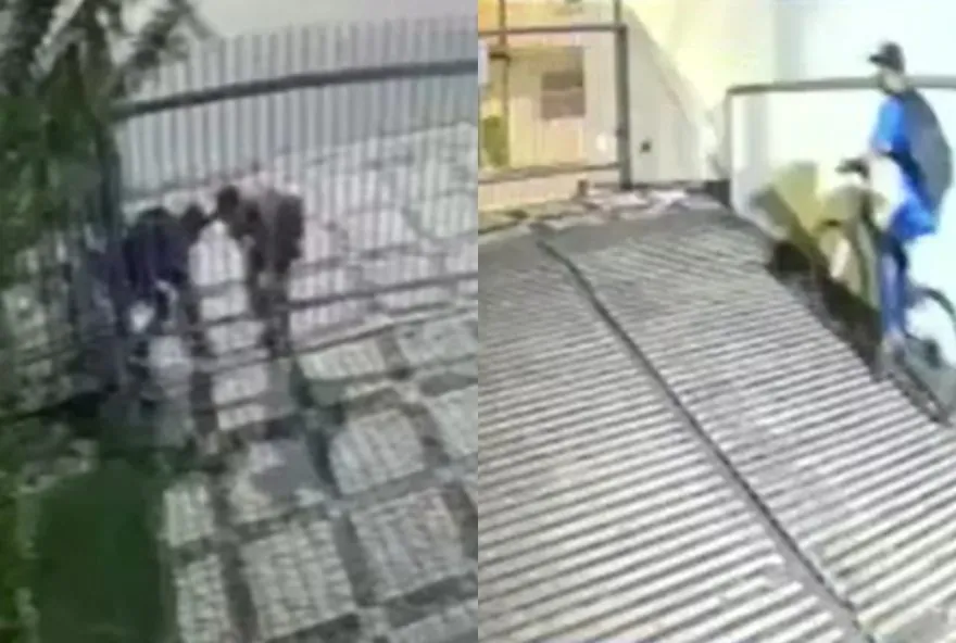 No vídeo, a dupla força o portão principal do prédio e consegue abrir uma brecha para entrar. Em seguida, eles correm até a garagem e pegam os veículos. Os homens fugiram pedalando do condomínio.
