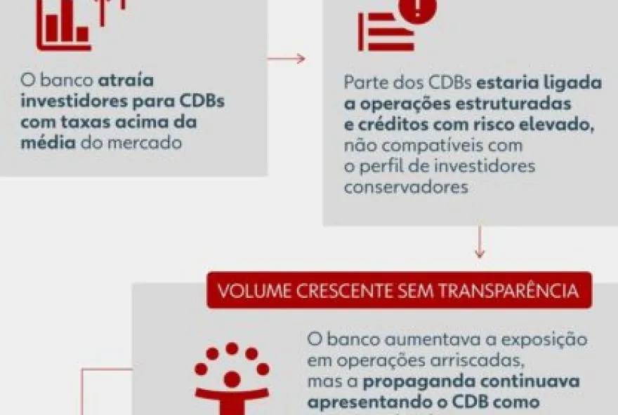 De acordo com a investigação da PF, o Banco Master emitiu R$ 50 bilhões em CDBs prometendo juros acima das taxas de mercado e sem comprovar que tinha liquidez. O Master aplicou parte do dinheiro dos CDBs em ativos inexistentes, gerando disputas entre o BRB e o próprio Banco Master.