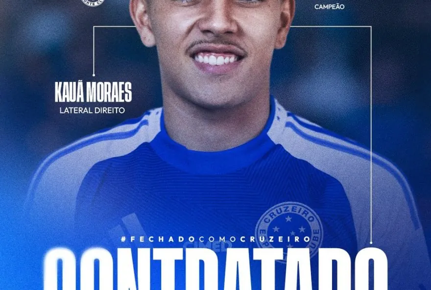 O Cruzeiro anunciou a contratação do lateral-direito Kauã Moraes, de 18 anos. O clube mineiro pagou a multa rescisória de quase R$ 10 milhões, prevista no contrato do jogador com o Athletico-PR, e assinou vínculo por cinco anos. A situação, inclusive, gerou desgaste entre as diretorias. O jovem desembarcou em Belo Horizonte na manhã do último sábado para passar por exames e se juntar ao elenco celeste nesta semana. Kauã Moraes chega ao Cruzeiro para suprir a ausência de Fagner, lesionado.