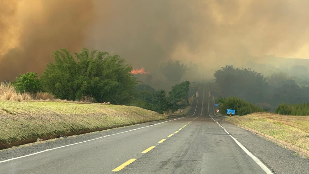 Incêndio de grandes proporções causa interdição total da BR-153 durante uma hora em Marília (SP). Corpo de Bombeiros atua no combate às chamas.