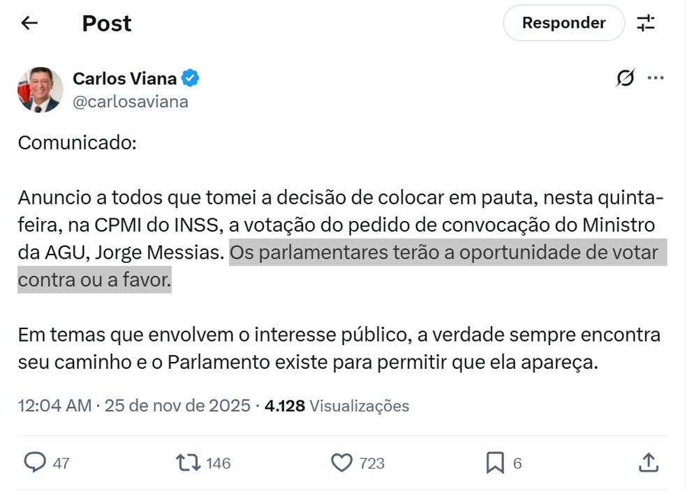 Presidente da CPMI do INSS inclui na pauta votação da convocação do Ministro da AGU. Posse de Jorge Messias no STF depende de sabatina no Senado.