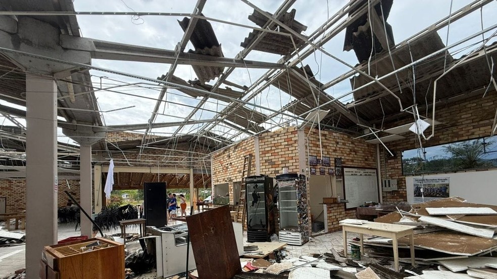 Temporal com vento forte destrói tradicional salão de festas em Jaraguá do Sul, SC, causando prejuízo de R$ 350 mil. Comunidade se une para reconstruir o espaço histórico.
