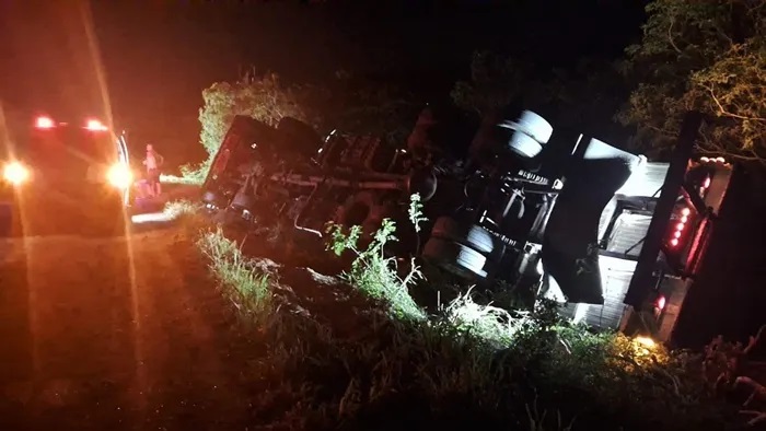 Carreta tomba na BR-324, Riachão do Jacuípe, povoado Santana, sentido Tanquinho, acidente de trânsito envolvendo carreta carregada de frutas e socorristas voluntários, sem vítimas graves.