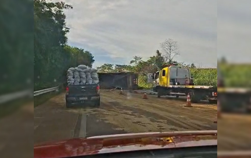 Carreta carregada com farelo de soja tomba e interdita SP-304 em Itaju: acidente sem feridos causa transtornos na rodovia