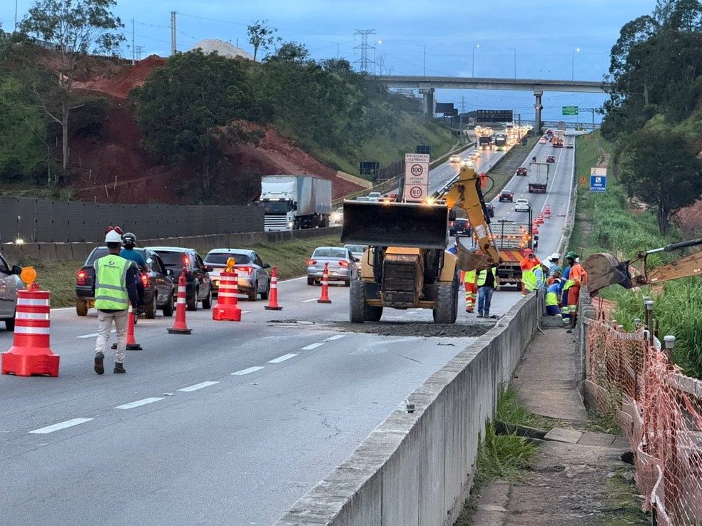 Chuva causa erosão na Via Dutra em São José dos Campos: Faixas interditadas e congestionamento de 5km no km 146. Equipes atuam na solução do problema.