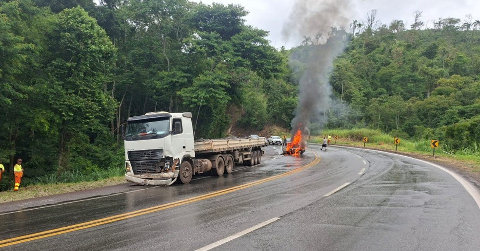 Grave acidente com mortos interdita BR-381 em João Monlevade sentido BH; carro pega fogo. Trânsito opera em sistema Pare e Siga. Confira detalhes.