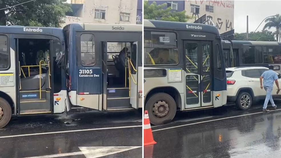 Engavetamento entre ônibus e carro deixa 10 feridos em Belo Horizonte. Motorista passa mal e causa acidente. Samu socorre vítimas. Acidente alerta para segurança no trânsito.
