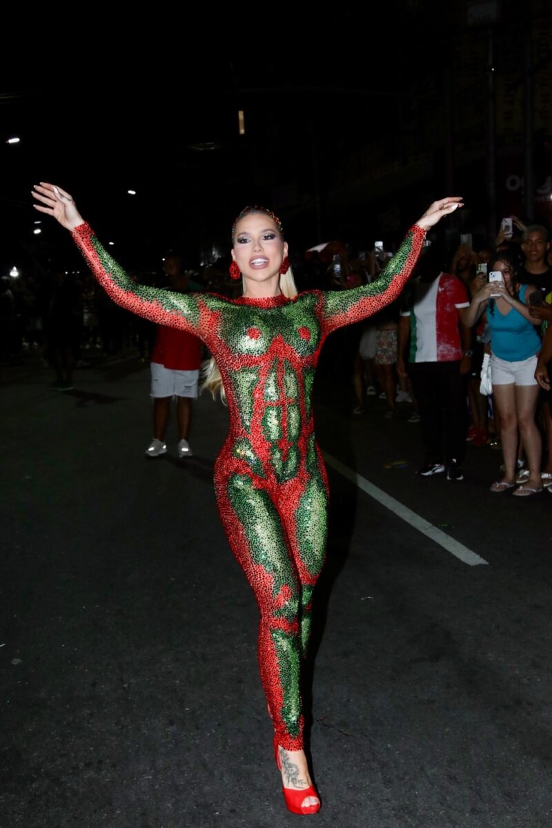 A influenciadora Virginia Fonseca arrasa em ensaio de rua com macacão de pedraria e brilha representando a Grande Rio. Confira seu estilo único e elegância!