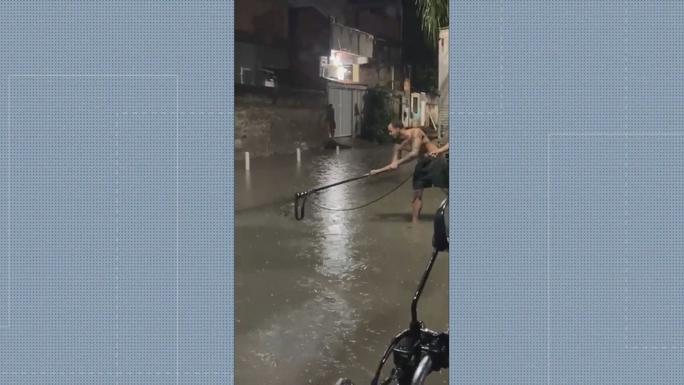 Moradores capturam jacaré em área alagada em Duque de Caxias. A ação gerou debate sobre segurança e manejo de animais silvestres em áreas urbanas.