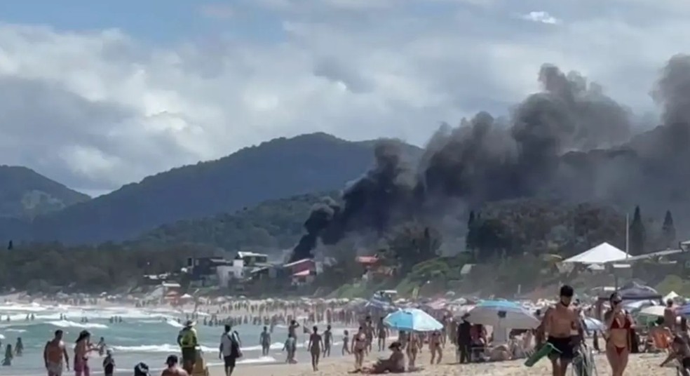Coluna de fumaça impressiona banhistas na praia do Campeche em Florianópolis após incêndio em casa próxima. Bombeiros agiram rapidamente e ninguém se feriu. Confira o vídeo!