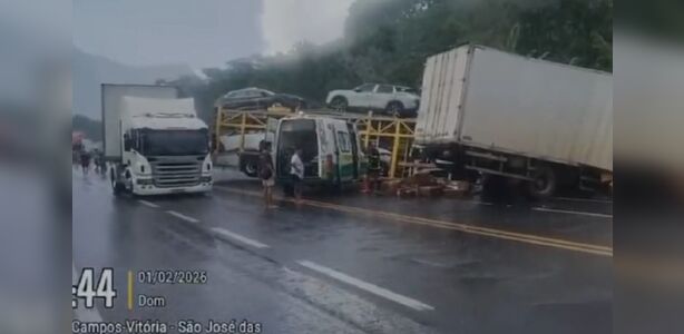 Acidente na BR-101 em Mimoso do Sul envolve caminhões e ônibus. Uma vítima grave e duas feridas. Trânsito liberado às 17h. Polícia Rodoviária no local.