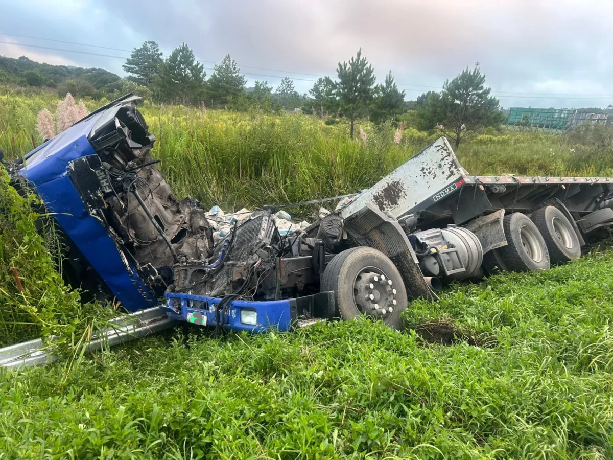 Acidente envolvendo duas carretas em Balsa Nova deixa veículo destruído, mas pista não é interditada. Três feridos leves.