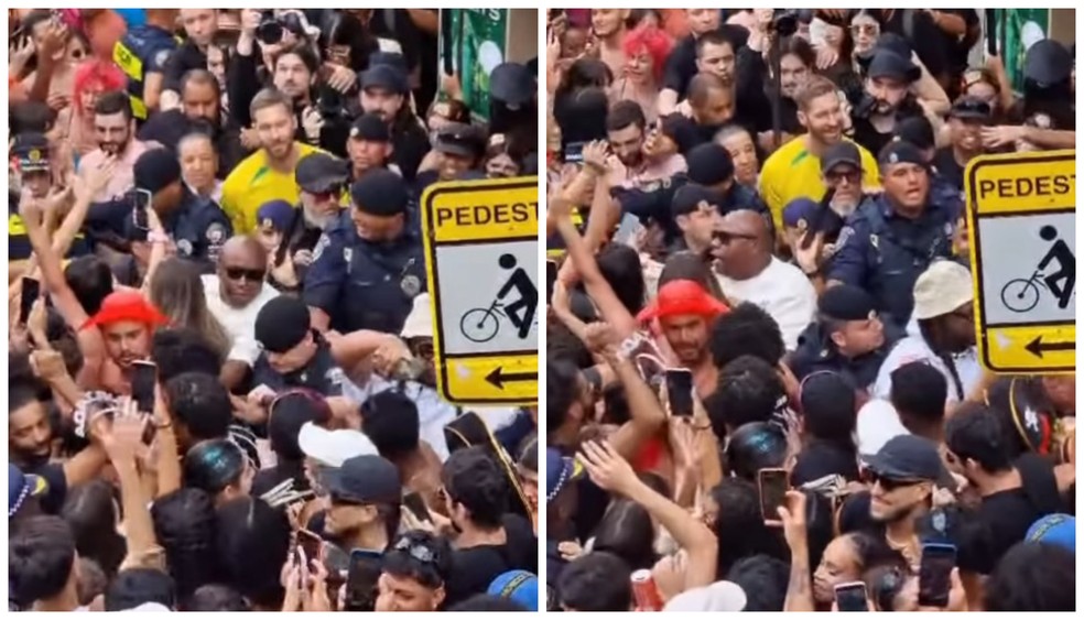 Calvin Harris causa tumulto em bloco de carnaval em São Paulo. Imagens mostram confusão e medidas de segurança tomadas para garantir fluidez do evento.