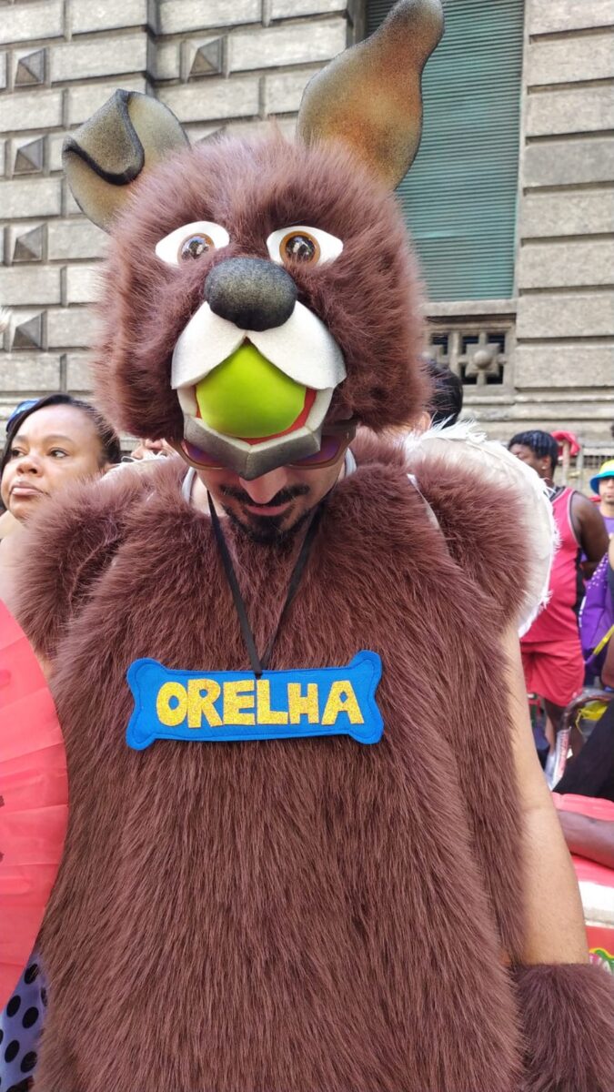 Folião presta homenagem emocionante a cão Orelha durante desfile do Cordão da Bola Preta, chamando a atenção para maus-tratos e pedindo justiça.