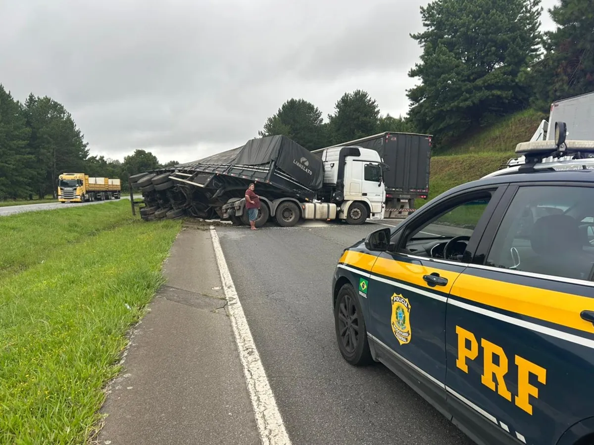 Acidente com caminhão carregado bloqueia BR-116 em Campina Grande do Sul. Motorista perdeu o controle, mas ninguém se machucou. Trânsito desviado pelo acostamento.