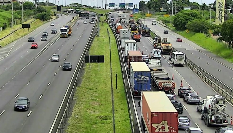 Acidente e obra causam congestionamento na Dom Pedro I em Campinas. Colisão entre carro e caminhão e intervenção emergencial geram lentidão de 4 km no km 145.