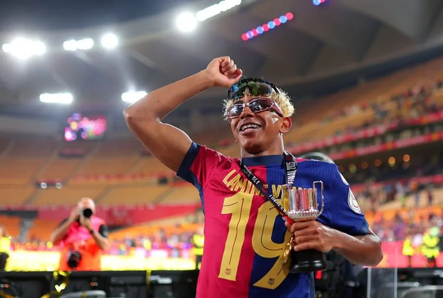 Lamine Yamal, que celebrou a conquista da 32ª taça da Copa do Rei pelo Barcelona, é considerado um dos talentos mais promissores das categorias de base do clube. Aos 17 anos, ele já disputou 54 jogos na temporada, marcando 18 gols e dando 22 assistências.