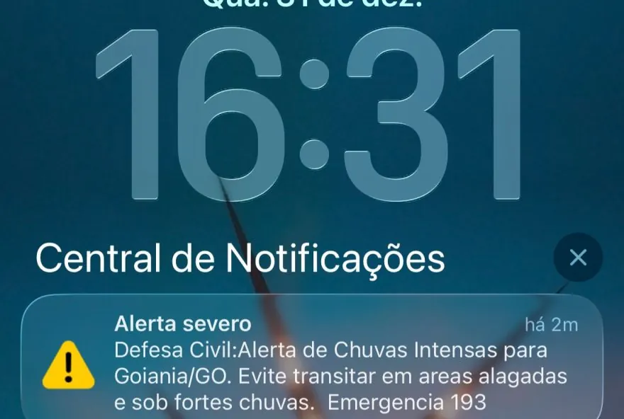 A Defesa Civil Municipal de Goiânia enviou um alerta sonoro de emergência para celulares, informando a população sobre o risco de chuvas intensas na capital e recomendando que busquem abrigo seguro. O aviso foi emitido nesta tarde de quarta-feira (31/12), alertando para a possibilidade de precipitações fortes e orientando os moradores a não realizarem deslocamentos desnecessários durante o período de maior risco.