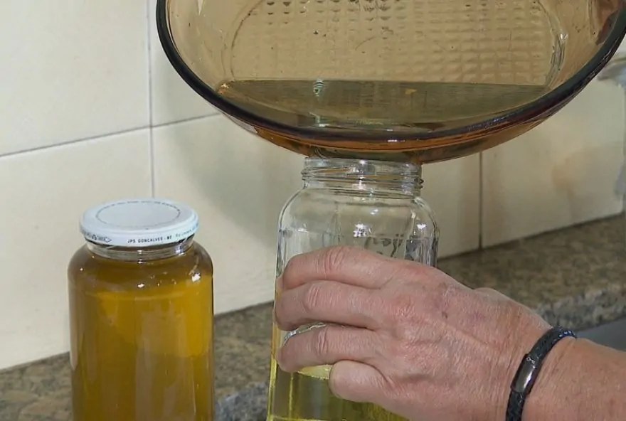 A professora explica que muitas pessoas acreditam que o óleo precisa ser filtrado para realizar o descarte. No entanto, é possível apenas retirar as partículas maiores, colocar em um recipiente e levar para um ecoponto.