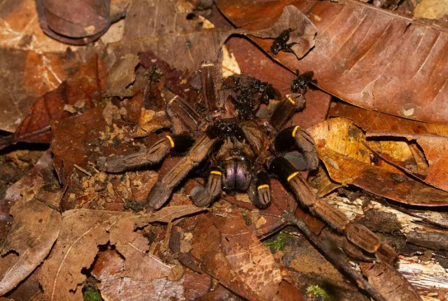 Abelhas abutres se alimentando da carcaça de uma tarântula — Foto: Guillaume Delaitre/iNaturalist