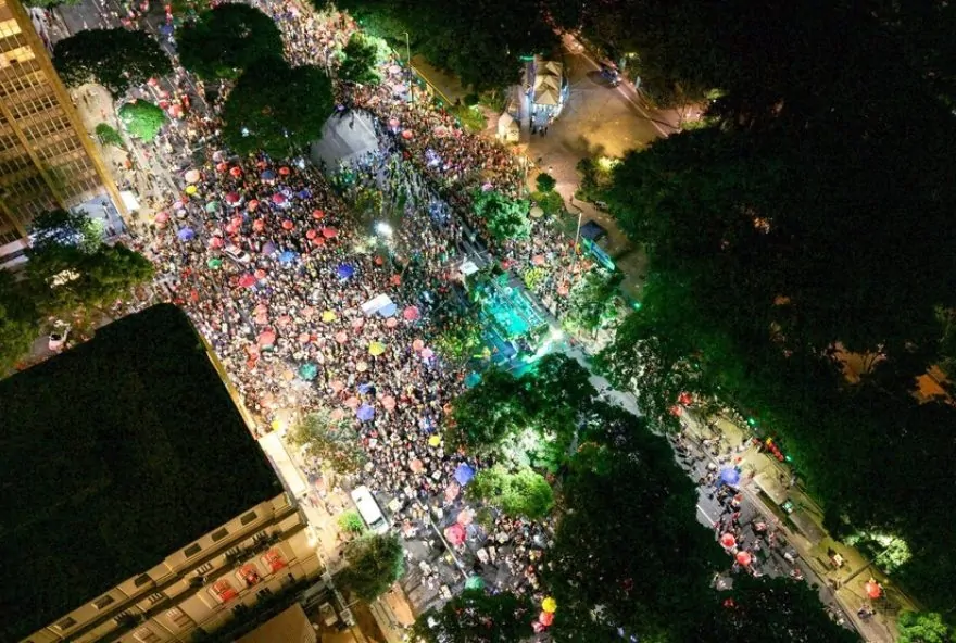 A Avenida Afonso Pena foi tomada por centenas de pessoas que acompanharam o desfile do Chama o Síndico, contagiados pela alegria e pela música animada que ecoava pelas ruas de BH. O trajeto do bloco incluiu o trecho entre o Palácio das Artes e a Praça Sete, atraindo olhares curiosos e despertando a simpatia de quem passava pelo local. O prédio na esquina da Rua Pernambuco com a Afonso Pena foi palco para a projeção do tema ‘Salve o Verde’, em uma harmonia visual que complementava a proposta do bloco.