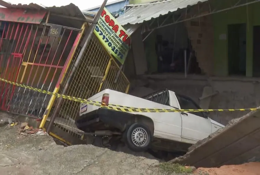 Chão de casa sobre córrego afunda após chuva na Grande BH, e carro cai em cratera