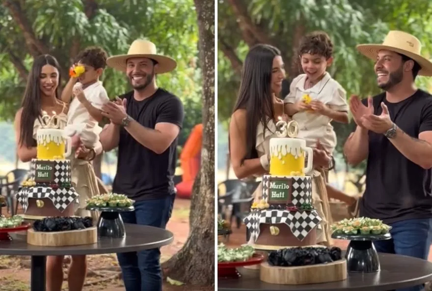Gabriela Versiani, noiva do cantor Murilo Huff, fez questão de decorar o espaço da festa de aniversário de 30 anos de Murilo, que contou com a presença do filho Leo durante a comemoração. O evento teve um tema de boteco e aconteceu em uma fazenda, proporcionando um ambiente descontraído e acolhedor para os convidados.