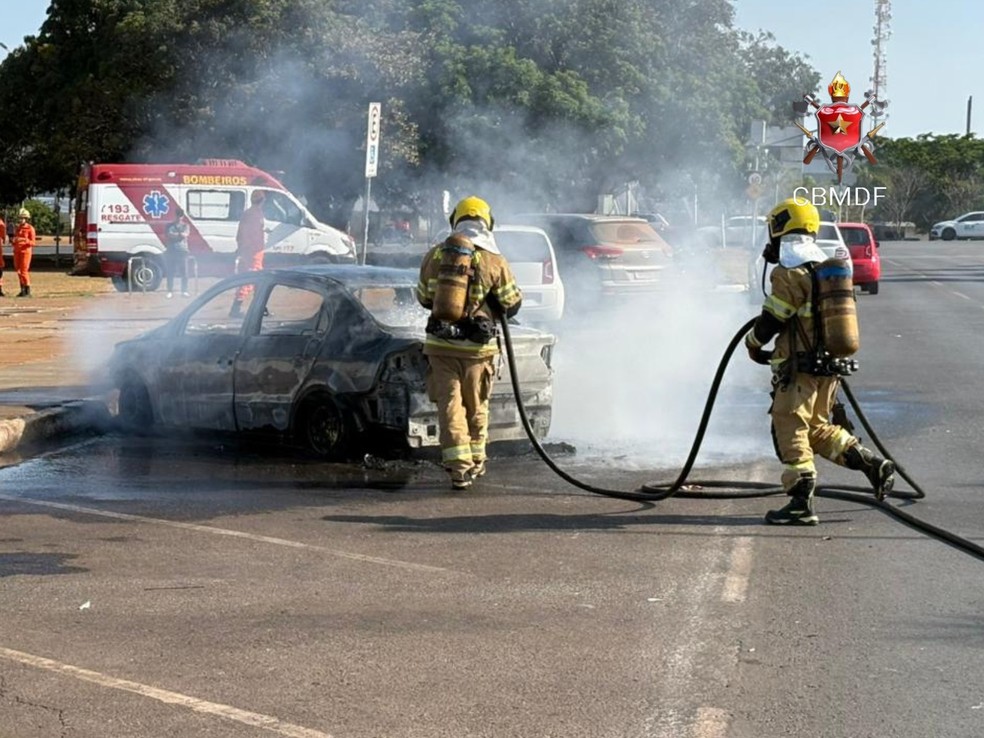 Carro pega fogo no Eixo Monumental em Brasília: Incêndio próximo ao Memorial dos Povos Indígenas é controlado pelo Corpo de Bombeiros
