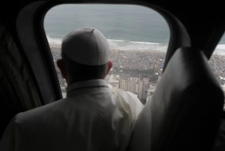 Do helicóptero, Francisco olha a praia de Copacabana tomada de gente, em 2013 — Foto: Divulgação