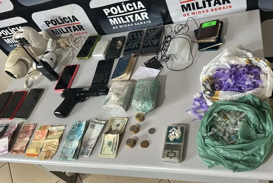 Durante as buscas, a polícia encontrou drogas, dinheiro, um simulacro de arma de fogo, balança de precisão, celulares, um rádio comunicador e um sistema de monitoramento de câmeras. O material estava em uma casa, apontada como ponto de venda de entorpecentes.