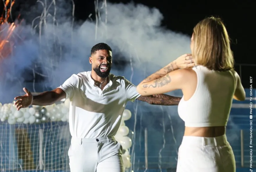 Decisivo pelo Paysandu no Re-Pa, Diogo Oliveira fez um chá revelação emocionante na Curuzu, marcando um momento especial ao lado da esposa, Marina Mabs, e de seus companheiros de equipe e amigos. O atacante bicolor comemorou o gol decisivo que marcou no clássico Re-Pa da Série B, que aconteceu no último dia 21 de junho, celebrando o sexo do primeiro filho do casal.