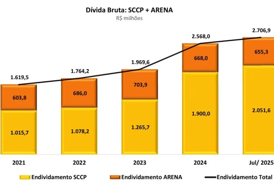 A dívida do Corinthians segue em crescimento e alcançou o patamar de R$ 2,7 bilhões. A informação consta no balancete financeiro de julho, divulgado pelo clube nesta sexta-feira. De tudo que o Corinthians tem que pagar, R$ 655 milhões são referentes ao financiamento da Neo Química Arena. O restante é de obrigações do clube, como impostos, empréstimos, pendências com outros clubes e direitos de imagem de jogadores. O balancete também mostra que, até julho, o Corinthians registrou déficit de R$ 103 milhões. A previsão do clube é terminar 2025 com um resultado financeiro negativo em R$ 83,3 milhões.