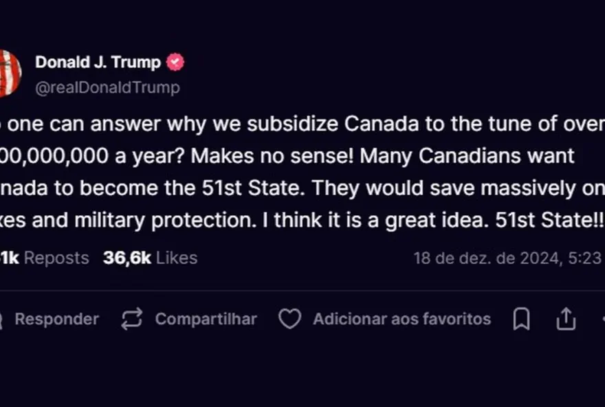 O presidente eleito, Donald Trump, provocou controvérsia ao sugerir a possibilidade de transformar o Canadá, seu vizinho ao norte, no 51º estado dos Estados Unidos. Ele afirmou em uma declaração nesta quarta-feira que considera a proposta uma ‘excelente ideia’. Esse comentário ocorre em meio a uma crise política nos Estados Unidos e despertou diferentes reações. Uma pesquisa recente mostrou que apenas 13% dos canadenses apoiam essa mudança radical. Muitos no Canadá e nos EUA se mostraram surpresos e preocupados com a sugestão de Trump. A proposta de ‘anexar’ um país soberano como o Canadá como um estado americano é vista como altamente controversa. Políticos e especialistas apontam que isso levantaria uma série de questões legais e políticas complicadas. A relação entre os dois países sempre foi de vizinhos próximos, mas independentes. A sugestão de Trump parece ir além do que muitos consideram razoável. O Canadá, como nação soberana, teria que concordar com a mudança, o que é altamente improvável. Por enquanto, a ideia apresentada por Trump parece mais um comentário polêmico do que uma proposta realista e viável.
