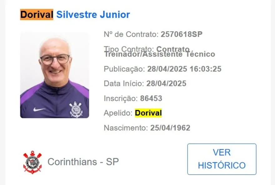 O vínculo de Dorival vai até o fim de 2026. O acordo entre Timão e Dorival foi selado na última sexta-feira, mas o clube aguardou a assinatura de contrato para confirmar a contratação. Mesmo sem ser anunciado, o treinador esteve no Maracanã, no último domingo, e acompanhou de camarote a goleada de 4 a 0 sofrida pela equipe para o Flamengo.