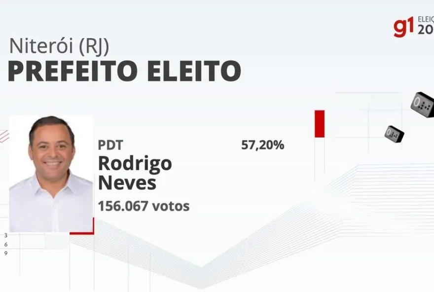 Rodrigo Neves, do PDT, foi eleito prefeito de Niterói em 27 de outubro, no 2º turno das eleições 2024, com 156.067 votos, 57,20% dos válidos – clique aqui para ver todos os dados da apuracao de Niterói