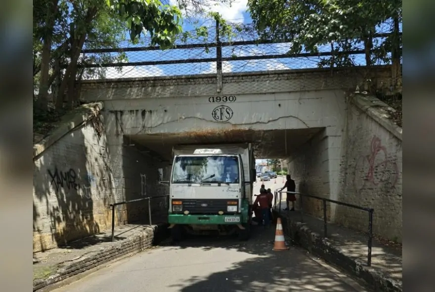 Um caminhão ficou entalado após tentar passar sob um pontilhão na Rua Doutor