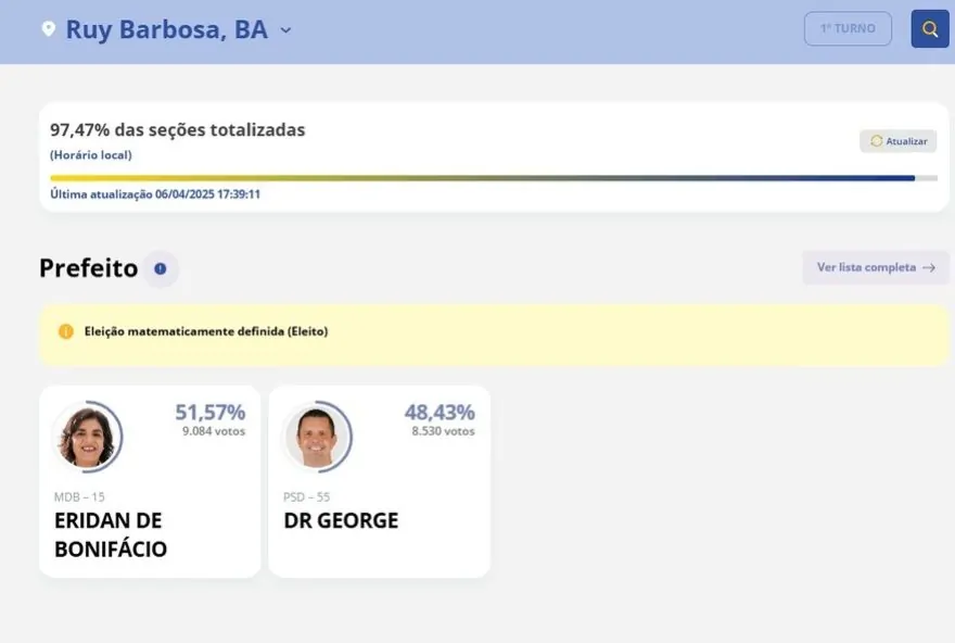 Eridan de Bonifácio, do MDB, conquistou a prefeitura de Ruy Barbosa com uma vitória expressiva nas eleições realizadas no último domingo (6). Com 51,57% dos votos, a candidata foi eleita para liderar a cidade, conforme a apuração realizada pelo Tribunal Superior Eleitoral (TSE). A vitória de Eridan de Bonifácio representa um marco importante para a política local.