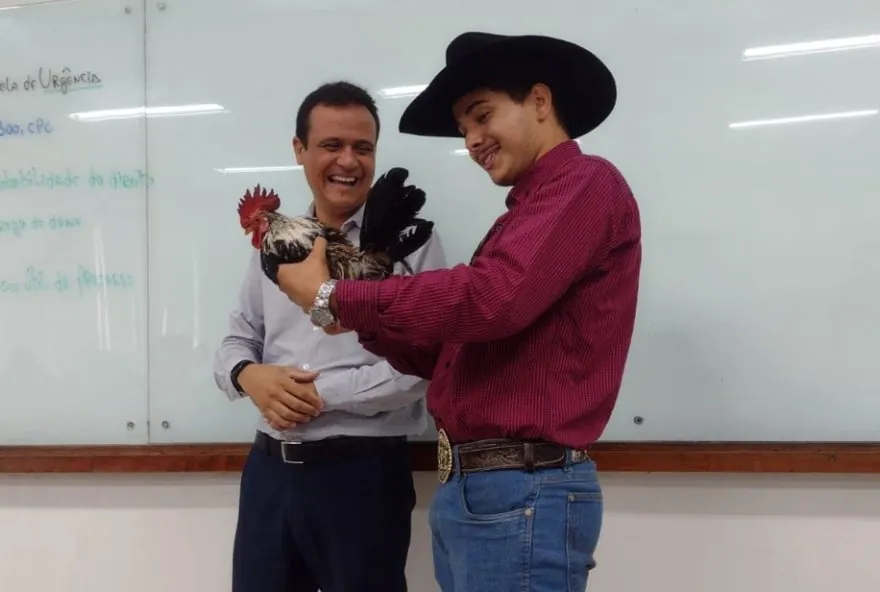 O estudante de direito Arthur Ferreira de Oliveira, de 20 anos, presenteou o professor de Processo Civil, Frederico de Castro, com um galo garnizé da raça nagasaki durante uma aula da faculdade. O vídeo mostra o aluno de bota e chapéu indo em direção ao professor com o galo nos braços. A turma batizou o animal de “Galindo”(assista acima).