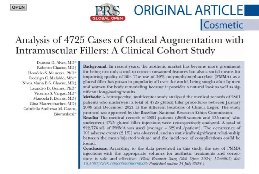No artigo, publicado sob o título Análise de 4725 Casos de Aumento Glúteo com Preenchimentos Intramusculares: Um Estudo de Coorte Clínico, foi revelado que o preenchimento glúteo com PMMA apresentou uma taxa de complicações significativamente menor em comparação com procedimentos cirúrgicos, como implantes de silicone (30,5%) e enxerto de gordura (10,5%).