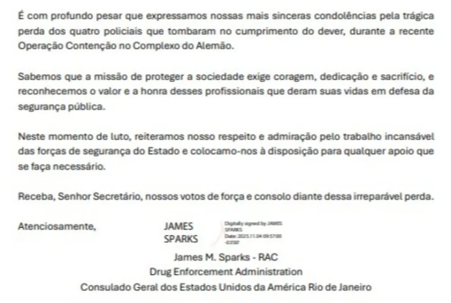 O governo dos Estados Unidos enviou condolências ao secretário de Segurança do Rio de Janeiro, Victor Santos, pela trágica perda de policiais na megaoperação nos complexos da Penha e Alemão na semana passada. O documento, assinado por James Sparks, representante da Divisão Antidrogas dos Estados Unidos (DEA), expressa profundo pesar pelos quatro policiais que faleceram no cumprimento do dever durante a Operação Contenção no Complexo do Alemão.