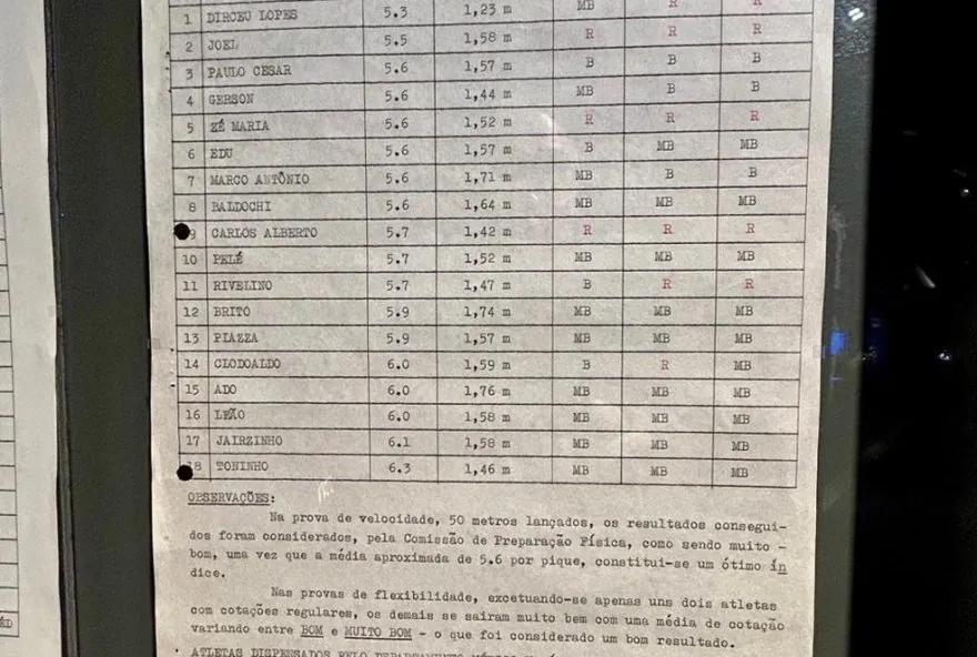 As peças mostram os resultados individuais dos atletas e indicam, curiosamente, que em alguns testes, como na corrida de 12 minutos, Pelé, aos 30 anos, foi avaliado como “bom”, abaixo do “muito bom” de outros colegas, como Jairzinho. A condição física sempre foi um dos trunfos do Rei.
