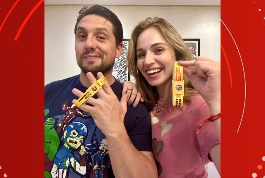 Tamara Wermuth e o noivo com as pulseiras do Planeta Atlântida 2025 — Foto: Arquivo pessoal/ Tamara Wermuth