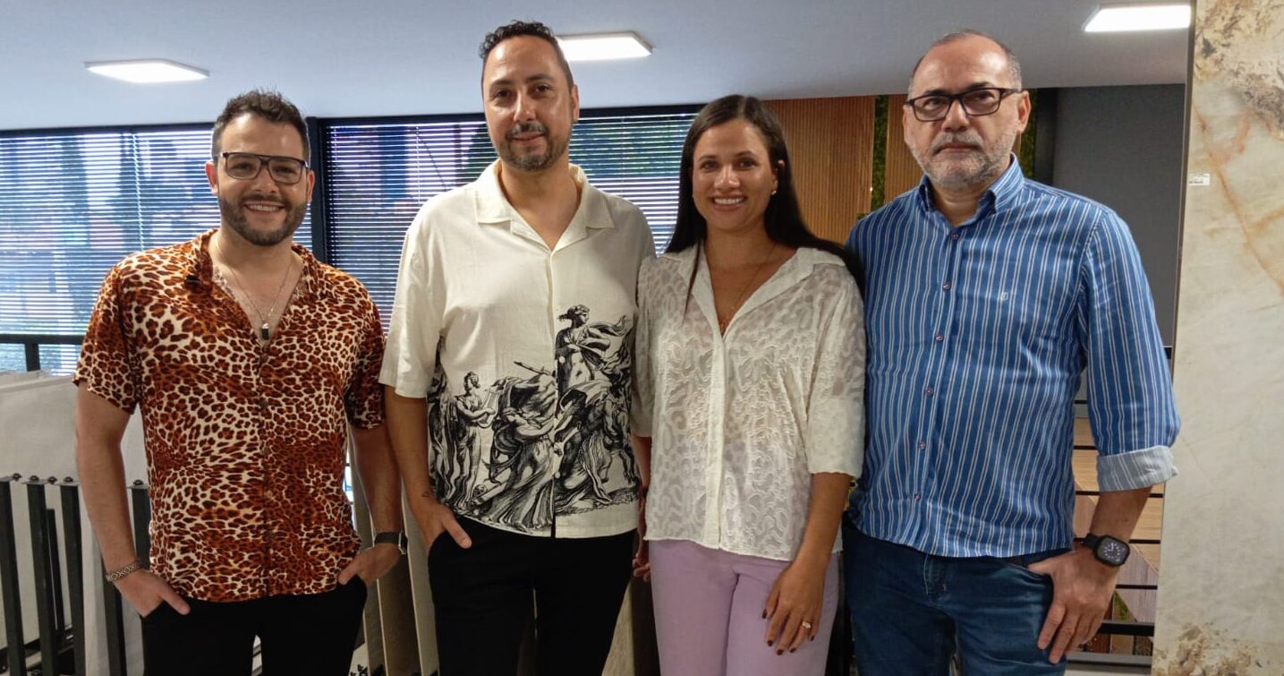 ARQUITETURA – O design Diego Miranda (à esquerda) e o arquiteto Zeh Pantarolli vieram de Curitiba para realizar palestra sobre uso da Inteligência Artificial na arquitetura para arquitetos goianos. Eles foram recebidos pela gerente da Essence Acabamentos, Karen Karoline. Também esteve presente Márcio Falk, superintendente regional da Roca Cerâmica, correalizadora do evento