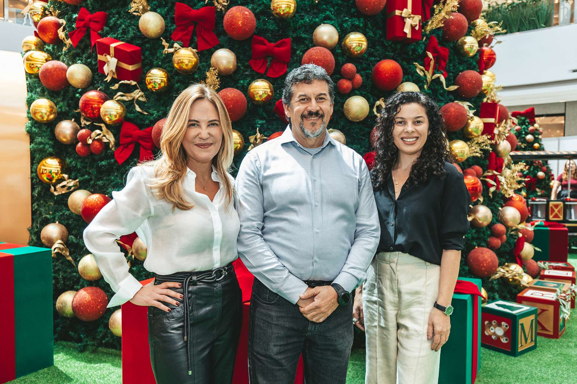 NATAL – Em clima de celebração, o Flamboyant Shopping apresentou à imprensa sua campanha de Natal 2025 – “Vila de Natal Flamboyant”, em evento exclusivo no restaurante Pobre Juan. Na foto, os anfitriões, a superintendente de operações Jucilene Oliveira, o superintendente comercial João Ricardo Gusmão Ladeia e a gerente de marketing Tânia Nascimento