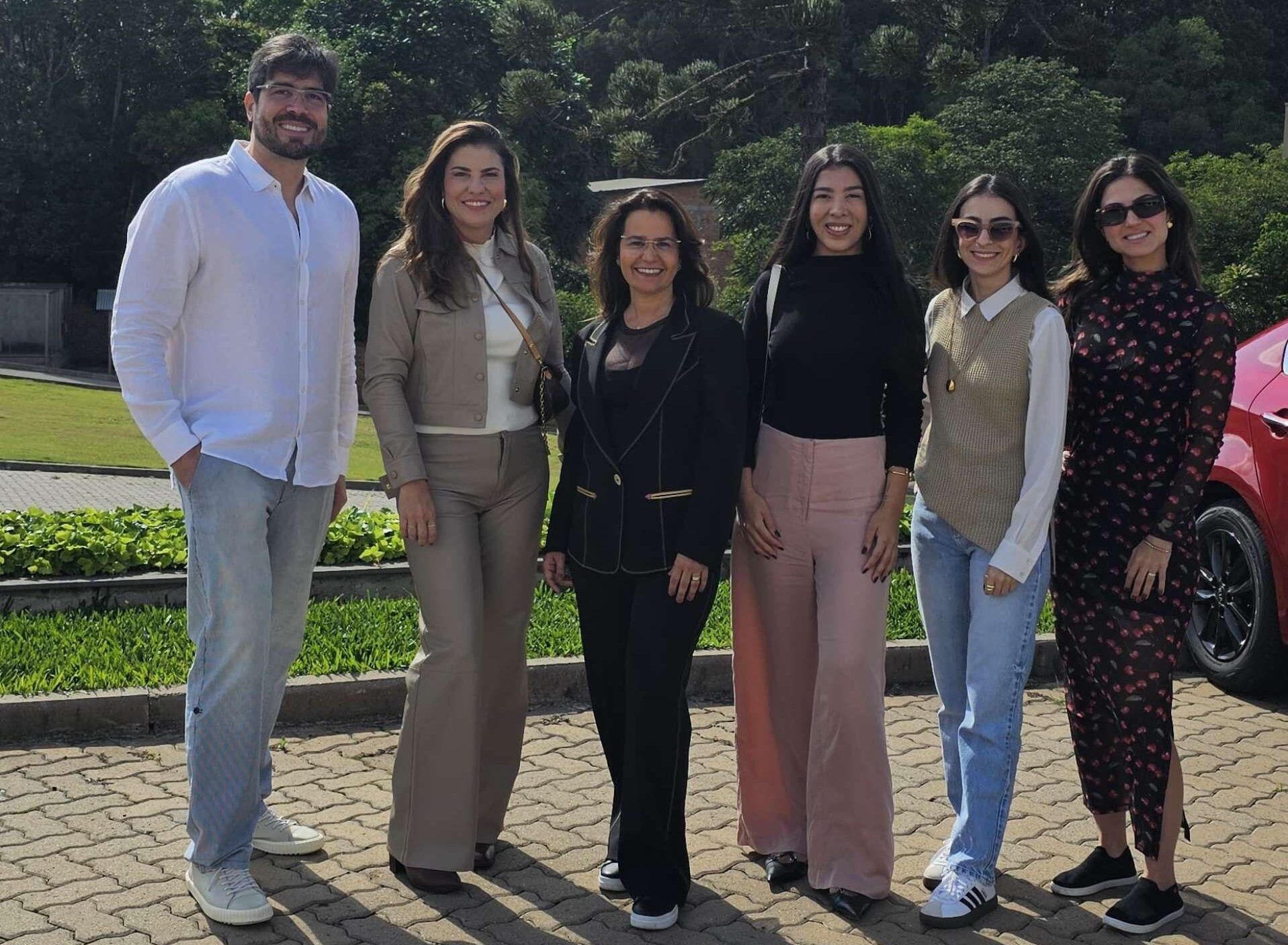 NO SUL – O empresário João Nelson de Azevedo Junior, franqueado da Bontempo Goiânia, recebeu um grupo de arquitetos de Anápolis, Goiânia e Rio Verde para uma imersão no universo da marca no Rio Grande do Sul, com visita ao parque fabril em São Marcos e ao Espaço Esperienza, em Caxias do Sul. Na foto, João Nelson, Michelle Mourão, Giovanna Diniz, Natiara Reis, Géssica Bessa e Bruna Guidon na chegada à fábrica