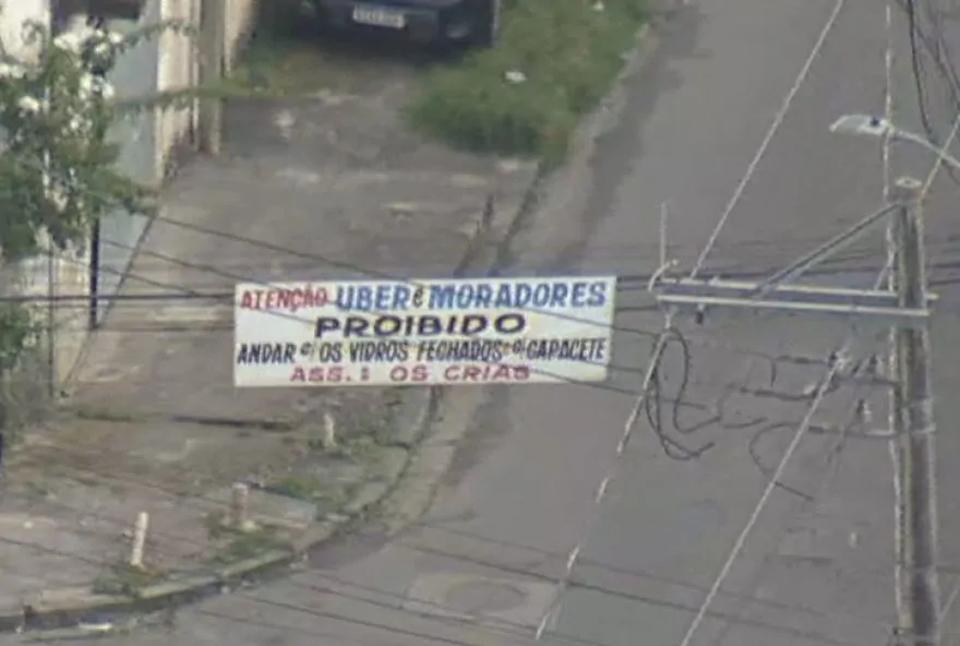 A mensagem da faixa, direcionada especialmente aos motoristas de aplicativo e aos moradores locais, proíbe veementemente o uso de vidros fechados e capacete. A assinatura ao final da mensagem traz a identificação “Os Crias”, que é uma forma como os bandidos da área se autodenominam, sem qualquer relação com a criminalidade envolvida na questão.