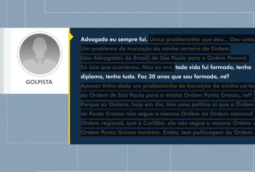 Um áudio enviado pelo golpista para uma vítima mostra ele tentando se explicar. Na mensagem, ele chega a citar que é formado há mais de 30 anos no curso de Direito. Confira acima.