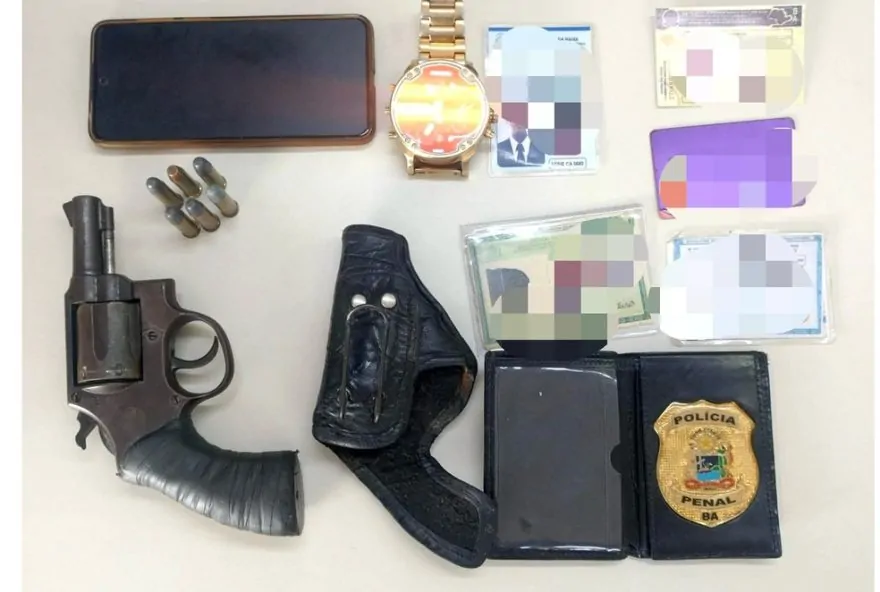 Na revista pessoal, os militares encontraram o distintivo e a CNH falsas, o veículo roubado, um revólver calibre 38 com numeração suprimida e munições, um coldre de cintura e outros objetos, como um aparelho celular e um relógio dourado. O suspeito e os itens apreendidos foram apresentados à Central de Flagrantes, onde a ocorrência foi formalizada.