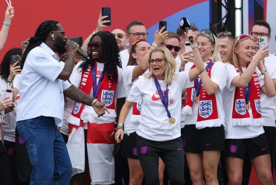 A técnica da Inglaterra se destacou ao dançar e cantar com o astro do hip hop Burna Boy durante a celebração do título da Euro Feminina. A festa que reuniu aproximadamente 65 mil torcedores em Londres foi marcada por momentos emocionantes e animados. A delegação desfilou em carro aberto pela cidade até chegar ao palco montado em frente ao Palácio de Buckingham, onde toda a festa foi realizada.