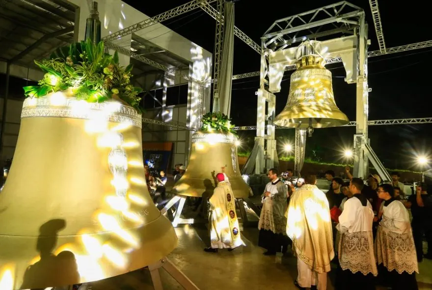 Bispo Dom José Roberto abençoa sino São João antes do badalo, Goiás — Foto: Wesley Costa/O Popular